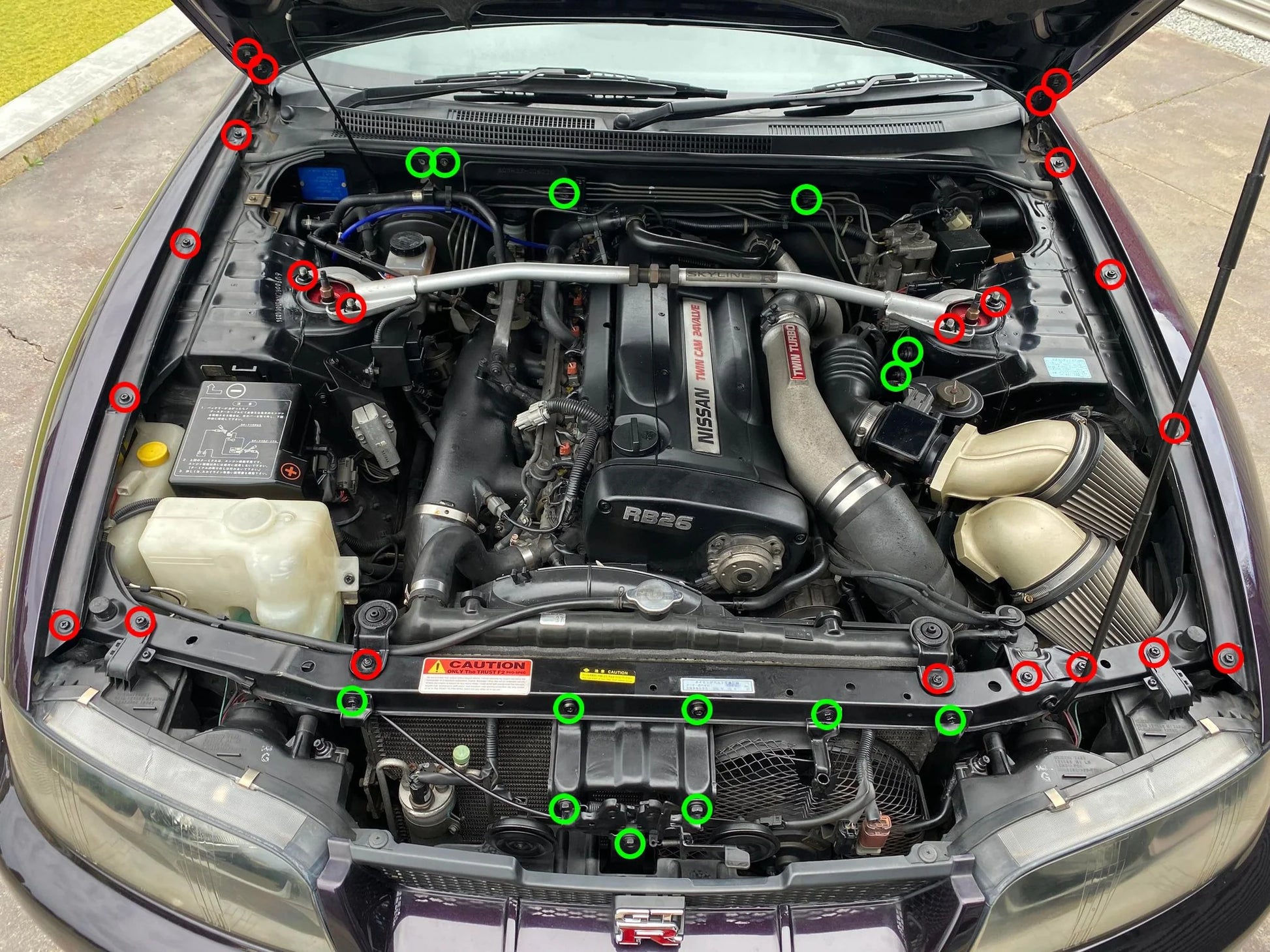 We have done the hard work for you and put together titanium hardware replacement kits for your Nissan Skyline R33 GTR (R32 & R34 similar) engine bay in a range of our signature colours.